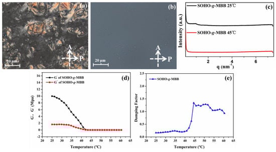 Figure 3. POM images of (a) SHSO-g-MBB at 25 °C and (b) SHSO-g-MBB at 43 °C; (c) SAXS curves of SHSO-g-MBB. The tests were performed at 25 °C and 43 °C. (d) The variations of storage (G′) and loss moduli (G″) of SHSO-g-MBB with temperature and (e) the damping factor of SHSO-g-MBB with temperature.