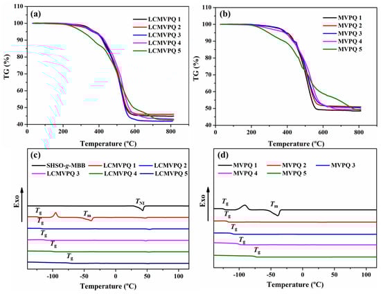 Figure 4. TGA curves of (a) all the synthesized LCMVPQs and (b) MVPQs; DSC traces of (c) SHSO-g-MBB and all the LCMVPQs and (d) MVPQs.