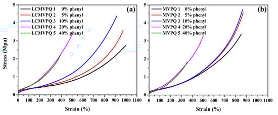 Figure 5. Stress-strain curves of (a) LCMVPQ 1–5 and (b) MVPQ 1–5. The curves were performed at 25 °C.
