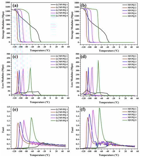 Figure 6. Storage modulus curves of (a) LCMVPQ 1–5 and (b) MVPQ 1–5; loss modulus curves of (c) LCMVPQ 1–5 and (d) MVPQ 1–5; and loss factor curves of (e) LCMVPQ 1–5 and (f) MVPQ 1–5.