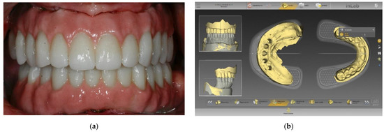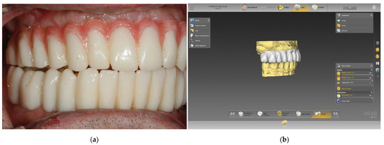 Clinical example of PMMA (Telio CAD Ivoclar-Vivadent, Schaan, Liechtenstein) used in an implant for temporary rehabilitation: (a) Lateral clinical view of the definitive prosthesis placed over five implants, (b) View of the design software used in this clinical case (inLab CAD Dentsply Sirona, York, PA, USA).