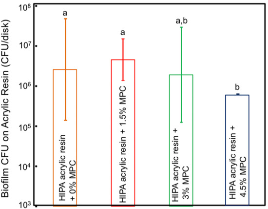 Bajunaid et al. investigated the influence of incorporating protein repellent agent (2-methacryloyloxyethyl phosphorylcholine-MPC) into a high-impact denture acrylic resin. They studied the effect of this modified acrylic resin on candida biofilm formation and on the surface roughness of the acrylic resin. The researchers found that adding MPC at 4.5% wt resulted in a significant fungal retardation and no effect on the surface roughness of the developed acrylic resin. The authors suggest that the newly developed denture material has the potential to prevent denture stomatitis (Figure 1 and Figure 2) and Table 2 [34]. Another study investigated the effect of the dual incorporation of MPC as a protein repellent agent and dimethylaminohexadecyl methacrylate (DMAHDM) as an antifungal agent to prevent the adherence of Candida albicans to the denture base material. This dual incorporation of MPC and DMAHDM reduced Candida albicans biofilm colony-forming unit by two orders of magnitude. Although the addition of MPC and DMAHDM alone or in combination significantly reduced the flexural strength of the material, they showed reduced roughness values when compared to control groups (Figure 3) [35].
