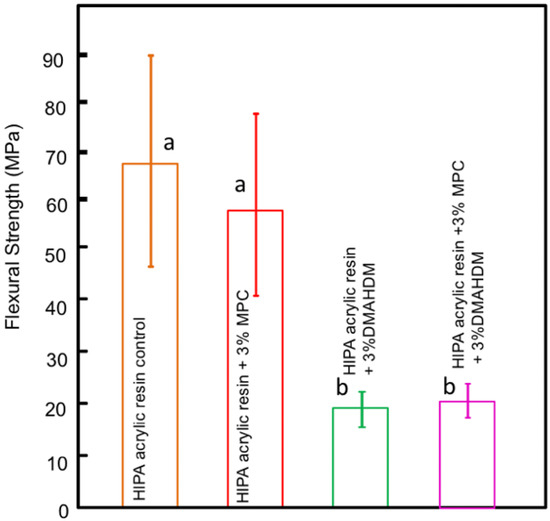 Flexural strength of the acrylic resin; similar letters indicate statistical similarity (Tukey’s test, p < 0.05).
