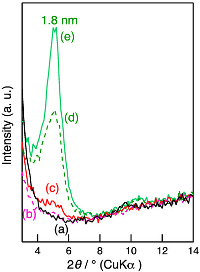 27]. While preparing the saponite-polyFe composite, saponite is dispersed in water. In water, saponite can swell and exfoliate. For this study, LIIm was diffused in MeOH. Because the imidazolyl group lies in the interlayer gap and is anchored to the layer of LIIm, it rarely swells and exfoliates in MeOH. Consequently, polyFe is rarely intercalated in the interlayer region of LIIm, resulting in polyFe/LIIm composites with an intriguing phenomenon that differs from clay-polyFe composites previously reported. The possibility of exfoliation will be discussed in the section below.