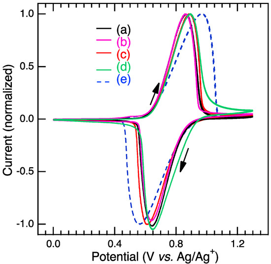 In the cyclic voltammograms, a pair of redox peaks appeared at 0.86–0.89 V vs. Ag/Ag