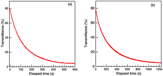 Figure 7). It took 785 s for polyFe/LIIm composite-3/1 film to recover 95% of the colored state in the open-circuit condition, although it took 236 s for the polyFe film. The logarithm of the transmittance (log T) exhibited linear decay vs. the elapsed time, i.e., the concentration of Fe