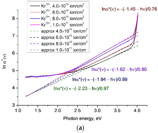 Figure 5 plots lnα*(ν) for the experimental results reported in [21] for PET samples irradiated with ions of Kr15+ and energy of 1.75 MeV/a.u. for various fluences, where we used a higher resolution of 0.1 nm than in [12]. As for our earlier results, there is a clear lower focal point at around ~1.3 eV, an upper focal point at ~4.1 eV, and an increase in gradient of the linear approximations to lnα*(ν) in the lower-energy Urbach edge region for increasing fluences.