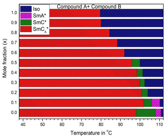 Compound A (x = 1.0) possesses the direct SmCA*-Iso phase transition at 81.5 °C. With the decrease in molar concentration of Compound A in the mixture, the temperature of the direct SmCA*-Iso phase transition increases by about ~11.5 °C to reach 92 °C (at x = 0.6). On further decrease in the mole fraction of Compound A, the SmC* phase starts to be more favorable. Mixtures with a direct SmCA*-Iso phase transition may be used as a component of mixtures in OAFLC materials to resolve the occurrence of chevron defects usually present in conventional materials possessing the Cr-SmCA*-SmC*-SmA*-Iso phase transitions; thus, these mixtures may be utilized as potential smart materials for high-contrast, 3D displays applications.