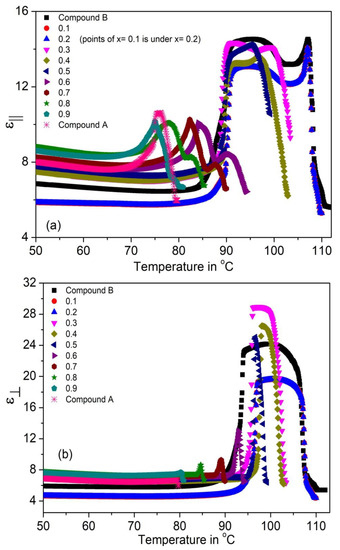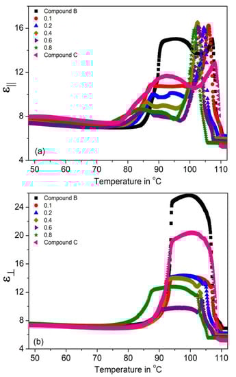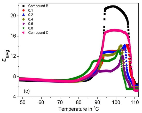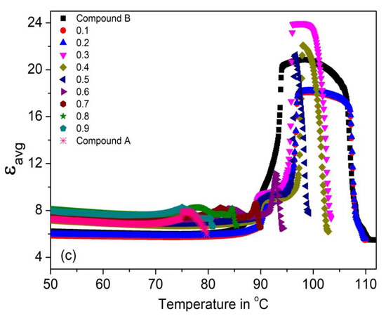The temperature dependence of the parallel and perpendicular permittivity’s (ε|| and ε⊥) and their average value εavg = (2ε⊥ + ε||)/3 for the (Compound A + Compound B) system is shown in Figure 4a–c, respectively. Figure 4b shows that ε⊥ values peak in the SmC* phase (~19–28); this enhanced value is due to the temperature-dependent fluctuations of molecules in the direction of the phase angle of the helical structure [69,70,71,72,73,74,75]. The increment of ε⊥ is greater than ε|| in the SmC* phase. The values of ε|| and ε⊥ are small and almost constant in the SmCA* phase, it increases sharply at the SmCA* − SmC* phase transition temperature for all mixtures. The static permittivity’s contribution in the SmA* phase is weak and is mostly due to the amplitude fluctuation of the polarization vector [76]. Moreover, the absence of the SmC* phase in Compound A leads to its low permittivity value.