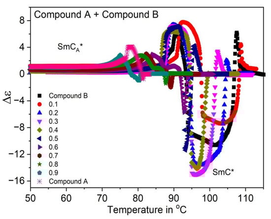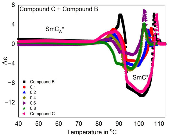 As observed from Figure 7 for the Compound C + Compound B mixture system, Δε increases abruptly in the SmC* phase and becomes more and more negative with the SmC* phase stabilization (broader temperature range) on changing the concentration.