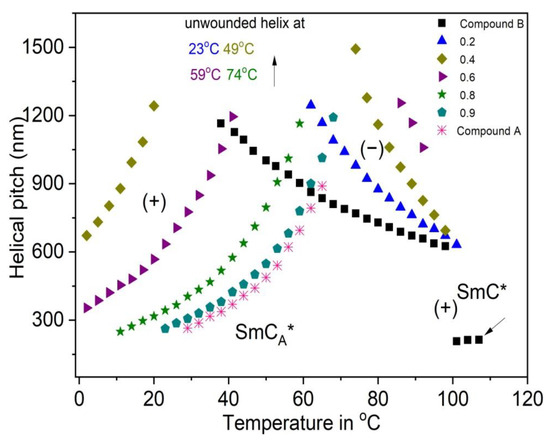 Temperature dependence of the helical pitch length for the Compound A + Compound B mixture system. Arrows of the corresponding color indicate the temperatures at which the helix became fully unwounded. The sense of the helical twist is indicated by “+” for the right-handed helix and by “− “for the left-handed helix.