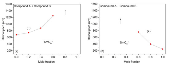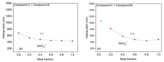 The sense of the helical twist (+ = right-handed helix, − = left-handed helix) and the temperature of the helix twist inversion (fully unwound helix) are also indicated in Figure 8. The parameters of the helix for chosen compositions of mixtures and pure compounds are compared. In the case of the Compound A + Compound B mixture system (for mixtures with x = 0.4 and x = 0.6), the right-handed helix at low temperatures and left-handed helix at high temperatures in the SmCA* phase is observed. For these mixtures, the helical twist sense inversion in the SmCA* phase is clearly present. In general, this behavior is typical for the system in which the compounds with different temperature characteristics and helix handedness are mixed [66]. Mixtures of the Compound C + Compound B mixture system form right-handed helix in the SmC* phase and left-handed helix in the SmCA* phase. As both compounds from this mixture system possess the same helix handedness in the SmC* as well as the SmCA* phases, the temperature characteristics of the helical pitch in binary mixtures are changed stepwise from one pure compound to the other. The helical pitch length measured in the SmC* phase is quite lower than that in the SmCA* phase.