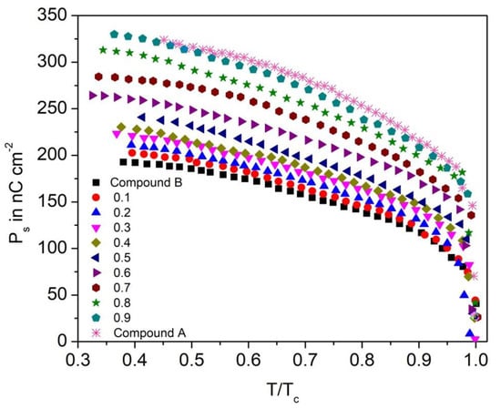 Figure 12 displays the reduced temperature (T/TC) from Curie point TC (SmA*-SmC* phase transition temperature) versus spontaneous polarization (Ps) for the Compound A + Compound B mixture system at different concentrations. The continuity of the Ps curve implies that the nature of the SmC*-SmA* phase transition is of second order.