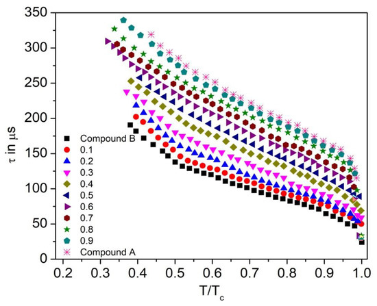 Reduced temperature dependence of the relaxation time (τ) for the Compound A + Compound B mixture system is presented in Figure 14, where Tc is the SmA*-SmC phase transition temperature. The values of the relaxation time are below 340 μs in the measured range of the antiferroelectric phase of the mixtures. The relaxation time of the mixture is proportional to its viscosity.