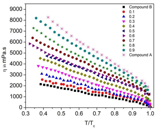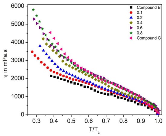 To study the dynamic behavior of the FLC and AFLC liquid crystal system, it is important to investigate its effective torsional bulk viscosity (η) [67]. It signifies the speed of the molecular rotation for the SmC* cone upon switching under an applied electric field. Figure 16 shows η as a function of reduced temperature (T/Tc) for the Compound A + Compound B mixture system. The η values are higher in the SmCA* phase than that in the SmC* phase and they follow almost similar trends, as it was observed for τ; η decreases with an increase in temperature. For this mixture system, η is minimum for pure Compound B (reaches ~2200 mPa.s in the SmCA* phase) and increases with the increase in molar concentration of Compound A in the mixture, reaching up to ~8000 mPa.s at 30 °C.