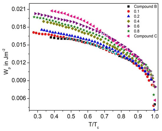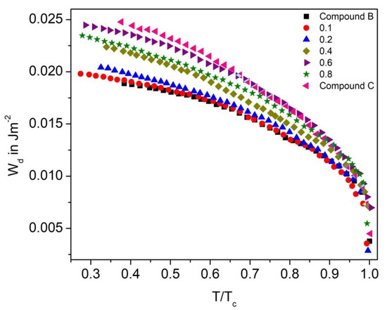Figure 18 shows the dispersion anchoring energy coefficient as a function of reduced temperature (T/TC) for the Compound A + Compound B mixture system. On increasing the temperature, the Wd values decrease and attain a minimum at the SmC*-SmA* phase transition temperature (Curie temperature). This pattern suggests that the enthalpy of the molecule continuously increased with temperature and thus broke their interaction barrier. The maximum value of Wd obtained in the Compound A + Compound B mixture is ~0.032 J.m−2 for Compound A and decreases with an increase in concentration of Compound B. For these binary mixtures, quite a small Wd value indicates the requirement of lower threshold voltage for the operation; therefore, the mixture with lower molecular concentration requires a low electric field to switch the molecules between the OFF and ON states.