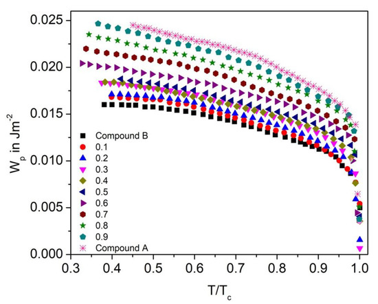 Polarization anchoring energy coefficient (Wp) versus reduced temperature T/TC for the Compound A + Compound B mixture system.