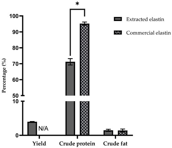 The results for yield, crude protein and fat composition are shown in Figure 1. This study obtained a 4 ± 0.09% yield of elastin (40 g of elastin/1kg of chicken skin). For comparison, the yield of elastin from jumbo squid’s skin is 1.4% [5], and in the fish bulbus arteriosus, the yield is 34.8% [34]. Extracted elastin consisted of 71.2 ± 1.99% of crude protein and 1.4 ± 0.39% of crude fat. The remaining 27% of the composition is accounted for the moisture and ash content of the extracted elastin. The results showed the effectiveness of the extraction process used in this study as it removed the majority of the fat content and retained more than half of the protein content. Chicken skin is rich in fats [35,36]. Thus, removing this fat content is a challenge as high-fat content can affect the sample’s protein and amino acid compositions. While comparing with the commercial elastin, the crude fat content is not significantly different (1.4 ± 0.48%), however it is significantly higher in terms of its protein content (95.2 ± 1.02%). The same goes while comparing with the protein content of the bulbus arteriosus of yellowtail (S. quinqueradiata) fish, which is 93% [34].