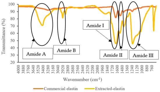 The secondary structure composition of proteins can be determined using FTIR spectroscopy. The FTIR spectra for extracted poultry-based elastin and commercial elastin from bovine neck ligament are shown in Figure 2.