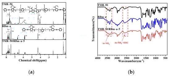 1H NMR (a) and FT-IR spectra (b) of A-staged blend resin (TMR–50/RDm–a–5) and that of thermosetting matric resin (TMR–50) and reactive diluent (RDm–a).
