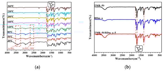 FT-IR spectra of the thermosetting blend resin (TMR–50/RDm–a–55) were cured at different temperatures (20–260 °C) (a) and cured at 380 °C/2 h (b).