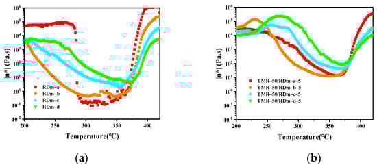 Melt viscosity of the B-staged TMR (a) and the blended resin TMR/RDm (50/50) (b) at different temperatures (200–400 °C).