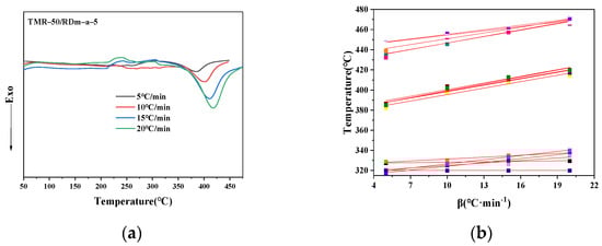 In order to explore optimal curing conditions and curing kinetics of the thermosetting blend resins, non-isothermal DSC tests were performed at different heating rates of 5, 10, 15 and 20 °C /min (Figure 7a and Table 4). The experimental results indicated that the characteristic temperatures including initial curing (Ti), exothermic peak (Tp), and terminal curing (Tt) all shifted to higher temperature area as the heating rate increased. For instance, when the heating rate increased from 5 °C/min to 20 °C/min, the Tp of TMR–50/RDm–a–5 increased from 384.9 °C to 418.2 °C, and Tt was increased from 447.2 °C to 470.5 °C, respectively. This could be interpreted by the enhanced thermal effect and larger temperature difference at higher heating rates. The characteristic temperatures (Ti, Tp and Tt) of the B-staged blend resin are plotted as the function of heating rates (Figure 7b). It can be seen that all of the characteristic temperatures increased linearly with increasing heating rates.
