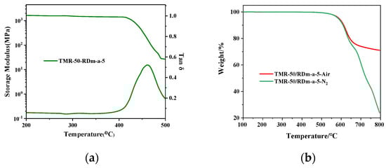 Figure 8a depicts the DMA curves of a representative thermosetting blend resin (TMR–50/RDm–a–5), which are the storage modulus and loss tangent (tan δ) as a function of temperature. Table 5 compares the characteristic temperatures including the onset temperature of storage modulus curves (Tonset), the glass transition temperatures (Tg). The Tonset values defined as the onset temperature of the storage modulus curve were measured in the range of 413–434 °C, and the Tg values defined as the peak temperature of tan δ curves were recorded in the range of 454–486 °C, which was decreased gradually with the increasing of Calc’d Mw, probably due to the lowering in the crosslinked density of the blend resins. The lower crosslinking density could result in an increase in the free volume of the cured blend resins [43]. The thermally cured blend resin (TMR–50/RDm–a–5) showed the Tonset of 423 °C and Tg of 462 °C, respectively, suitable for 370 °C carbon fiber composite applications.