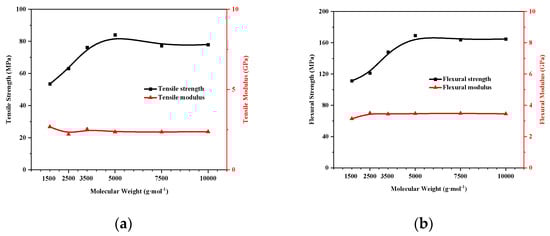 Table 6 compares the flexural and tensile properties of the thermally cured blend resins at room temperature. With the increase of Calc’d Mw from 1500 to 5000 g/mol, the tensile strength of the thermally cured blend resins increased from 53.5 MPa to 84.0 MPa, and the flexural strength increased from 113.3 MPa to 169.2 MPa, respectively (Figure 10). This is mainly attributed to the polymer chain-extension by increasing the Calc’d Mw. When Calc’d Mw is higher than 7500 g/mol, the tensile strength and flexural strength kept almost constant, without further increasing, indicating that the impact of polymer chain length on mechanical properties was not apparent. The elongation at breakage was also increased from 2.6% to 4.1% with increasing of Calc’d Mw from 1500 g/mol to 5000 g/mol, and then become almost constant with a further increase of Calc’d Mw from 7500 to 10,000 g/mol. The tensile and flexural modulus did not change obviously with the changing of Calc’d Mw. Overall, TMR–50/RDm–a–5 showed the best combined mechanical properties with the tensile strength of 84.0 MPa, tensile modulus of 2.4 GPa, elongation at breakage of 4.1%, the flexural strength of 169.2 MPa, and flexural modulus of 3.5 GPa, respectively. This result also agreed with the reaction mechanism of the PEPA which was mainly by chain extension rather than cyclization [44,45]. So we next compounded this system with T700 carbon fiber to prepare polyimide based carbon fiber composites.