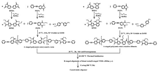 In our previous report, a reactive dilute derived from 4-phenylethynyl phthalic anhydride (PEPA) and meta-phenylenediamine (m-PDA) have been synthesized, which showed effective improvement in melt processing performance of the thermosetting polyimide matrix resins for 350 °C applications [35]. In this work, a series of phenylethynyl-endcapped oligomers with Calc’d Mw of 600–2100 were prepared, which were used to dilute the thermosetting polyimide matrix resins for 370 °C carbon fiber composite applications. The influence of Calc’d Mw of the reactive diluents as well as thermosetting poly(amic ester) resins on the melt processability, thermal and mechanical properties of the thermosetting blend resins have been systematically investigated.