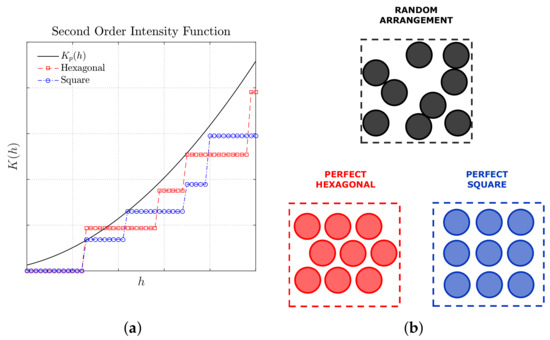Taking into account the fiber distribution in the cross-sectional area of a unidirectional fiber-reinforced composite material, if the plot provides a monotonic positive response, the fiber distribution can be considered to be non-periodic. Moreover, comparing the plot of to the plot it is possible to verify if the fibers are either dispersed or agglomerated. For instance, if it can be assumed that the distribution presents some degree of dispersion. Contrariwise, a response means that the fibers in the distribution are more agglomerated or clustered. Figure 1 shows the second-order intensity function plots expected for arrangements with same number of fibers and same area of study, distributed in random, hexagonal, and square patterns. It is possible to observe from Figure 1 the resulting stair-shaped of function for the periodic distributions in square and hexagonal arrangements. In addition, it can be realized that the fibers arranged in the periodic distributions in Figure 1 have some degree of dispersion, since their plots are under the plot for different values of h.