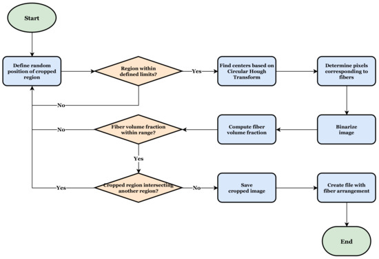 In the next step, the fiber volume fraction of the cropped region is obtained computing the proportion of the number of pixels representing the fibers to the total number of pixels of cropped regions. More details about this adopted strategy are presented in following paragraphs. Depending on the position where the region is cropped from the cross-section micrograph, the fiber volume fraction may change. For instance, if the defined position lies in a portion that has a high concentration of matrix, a low value of fiber volume fraction is computed. On the other hand, if the defined position lies in a portion that has a high concentration of fiber, a high value of fiber volume fraction is then computed. Therefore, if the computed fiber volume fraction is not within the range previously defined, the algorithm goes back to the first step where a new position for the cropped region is defined. If the computed fiber volume fraction is within the defined range, it is then verified if the cropped region is intersecting, or overlapping, another cropped region previously defined. This step is particularly important to avoid the similarity between the cropped regions ensuring the diversity of images in the generated bank.