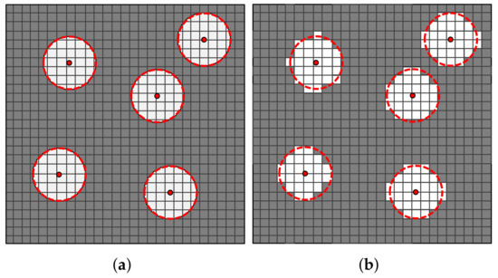 Representation of a fiber/matrix distribution with deviations between the expected area for the whole circumference (a) and the area of a set of pixels within a circumference (b). The white squares represent the pixels corresponding to the fibers and the gray squares represent the pixels corresponding to the matrix. The red dashed lines represent the circles obtained with the support of MATLAB function imfindcircles().