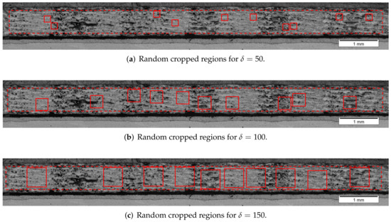 The methodology summarized in Figure 2 was applied to sampling the regions from the main micrographs. To cover a wide range of sizes of cropped regions, i.e., from a minimum representative size up to the limit imposed by the vertical size of the cross-section micrograph, the parameter was set to . For each parameter , a set of ten non-intersecting random regions was defined. Therefore, in the present work 150 regions were cropped from each one of the cross-section micrographs totalizing 450 analyzed images. Figure 5 shows the regions cropped from the cross-section micrograph of the sample TE-90-4-1 for , , and . The dashed red rectangles in Figure 5 show the area of search and the red squares depicts the random cropped regions. The target fiber volume fraction was set to , which is close to that experimentally measured and to that found in the literature.