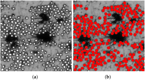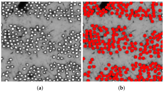 Application of the proposed algorithm in a cropped region of specimen TE-0-1-1: (a) reproduction of a cropped region from original micrograph used for computing the microstructure and (b) computed microstructure using the proposed algorithm. The computed fiber volume fraction is .
