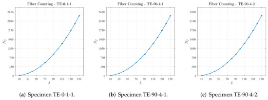 Figure 9 presents the number of fibers that were identified in the cropped regions for each one of the analyzed cross-section micrographs. Since the range adopted for targeting the fiber volume fraction was considerably tight, the standard deviations, represented by the error bars, of the counted fibers for a given size are very small and can barely be seen in the curves for all samples. Another consequence of the tight targeted fiber volume fraction is the overall similarity between the curves obtained for all samples, i.e., the number of fibers identified in one of the samples, for a given size , is practically the same of those obtained for the other samples. From the methodology point of view, it can be said that the algorithm herein proposed to identify the fibers from cross-section micrographs is very robust and effective.