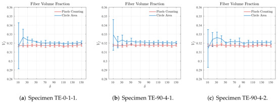 Previously, in Section 3, the methodology applied for determining the fiber volume fraction was presented. In this case, the proportion of the number of pixels representing the fibers to the total number of pixels of cropped regions was computed. Therefore, prior to the statistical characterization of the cropped regions, the effect of the adopted strategy in comparison to the fiber volume fraction computed using circumference areas was verified. Figure 10 displays the mean and standard deviation (represented by the error bars) values for the fiber volume fraction, computed using both the pixels counting and circumference areas, obtained for the regions cropped from the cross-section micrographs samples TE-0-1-1, TE-90-4-1, and TE-90-4-2 for different sizes.