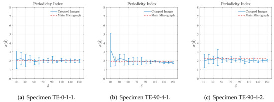 Figure 11 shows the results for the periodicity characterization obtained computing the standard deviation of nearest neighbor distance for different sizes of the cropped regions. A reference value of the standard deviation computed for the main region of the cross-section micrograph, i.e., the standard deviation computed for the whole area of search, exemplified in Figure 5, is also plotted in Figure 11. A preliminary inspection on the results shown in Figure 11 confirms that the fiber arrangement of the 3D-printed reinforced layers is non-periodic since . It is also verified in Figure 11a that the results obtained for cropped regions with size converge to those obtained for the main region of the cross-section micrograph from sample TE-0-1-1. From the results obtained for the samples TE-90-4-1, shown in Figure 11b, and TE-90-4-2, shown in Figure 11c, it is possible to verify that the cropped regions with size are able to represent their respective main regions of the cross-section micrograph according to the periodicity criteria adopted for the nearest neighbor distance.