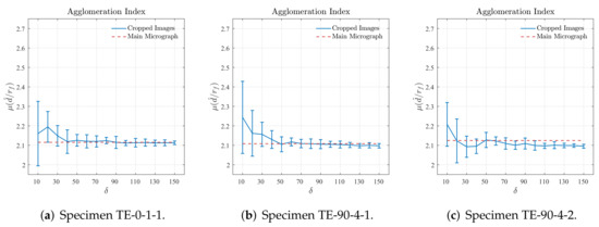 Figure 12 displays the results for the agglomeration characterization obtained computing the mean value of nearest neighbor distance for different sizes of the cropped regions. Analogously to the results presented for the periodicity characterization, the mean value computed for the main region of the cross-section micrograph is also plotted in Figure 12. The results obtained for the main region of the cross-section micrograph confirm that the fiber arrangement of the 3D-printed reinforced layers has a high degree of agglomeration since . It is verified in Figure 12a,b that the results obtained for cropped regions with size converge to those obtained for the main regions of the cross-section micrographs from samples TE-0-1-1 and TE-90-4-1. In Figure 12c, it is possible to verify that the results obtained for the cropped regions converge to a value slightly lower than that obtained for the main region of the cross-section micrograph of sample TE-90-4-2. However, it is also possible to observe that the results obtained for the cropped regions with size and are very close to that obtained for the main region of the cross-section micrograph. Based on the previous notes, it is suggested that cropped regions with size or are suitable to represent their respective main regions of the cross-section micrograph according to the agglomeration criteria adopted for the nearest neighbor distance.