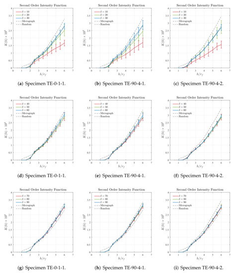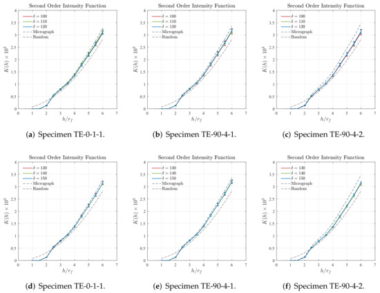 From the results shown in Figure 13a–c it is suggested that cropped regions with small sizes are not recommended to represent the main region of the cross-section micrographs, according to the Second-Order Intensity Function. For instance, the results obtained for the cropped regions with are considerably far from those obtained for the main cross-section micrograph mostly for higher values of the . Similar behavior is identified for the results obtained for the cropped regions with size although for the sample TE-90-4-2 the results are significantly better than those obtained for . For the cropped regions with size , the results are slightly better than those obtained for the cropped regions with size and . However, it can be verified that they are closer to those obtained for random distributions than to those obtained for the main region for the cross-section micrographs.