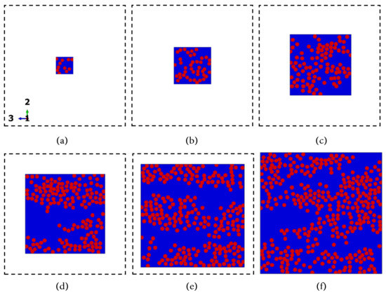 As an illustration of the finite element models adopted in the current analysis, Figure 16 displays the finite element discretization applied to the cropped regions with size , where the thermoplastic matrix is represented in blue, and the fibers are represented in red. In Figure 16 the cropped regions were discretized according to the details in Table 6. To provide a direct comparison between the size of the discretized regions, dashed line squares with size were also included in Figure 16. For all the finite element models herein adopted, the element size corresponds to one pixel size according to their respective computed microstructures.
