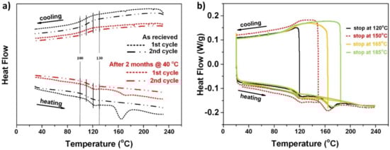 DSC results. (a) As-received and stored for two months after heat treatment (200 °C for two hours); (b) cyclic test.