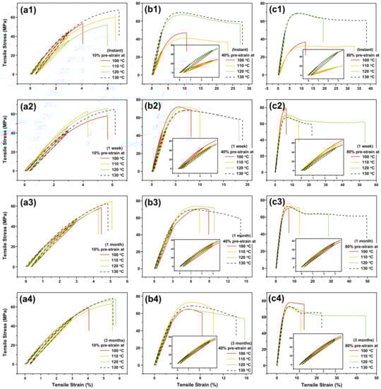If the stretching strain is small, e.g., 10% (Figure 4a1–a4), for all four stretching temperatures, the resulted samples are always brittle and the corresponding stress versus strain curves are only slightly different from that of the original sample. Hence, the transition from brittle to ductile is determined by two processing parameters, namely stretching strain and stretching temperature, i.e., the programming strain and programming temperature. Even after three months at 40 °C, the fracture strain of the sample pre-stretched to 80% strain at 120 °C is about 45%. Thus, the transition from brittle to ductile is not a short-term effect. The influence of pre-stretching is not only on the fracture mode, but also on the Young’s modulus (i.e., the slope of the stress versus strain curve in the early loading/unloading part).