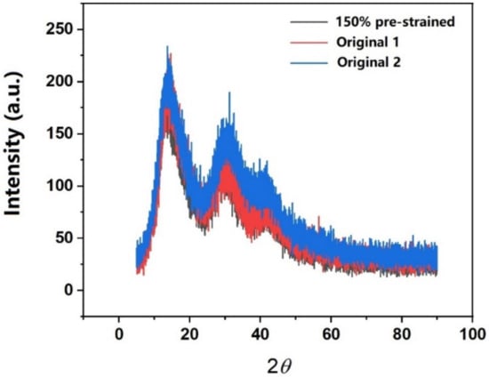 Two original samples and one pre-stretched samples (to 150% at 160 °C) were tested. The corresponding XRD spectra are plotted in Figure 5. It appears that the spectrum of the pre-stretched sample is almost the same as those of the original samples. In other words, the microstructure of polymer chains is not changed after high-temperature stretching.