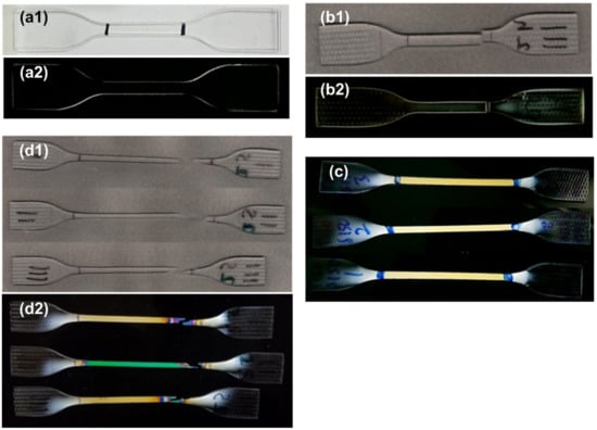 Typical images of (a1) original sample (normal optical image); (a2) original sample (photoelasticity); (b1) typical brittle fracture sample (placed together with a small gap between two fracture parts) (normal optical image); (b2) typical brittle fracture sample (placed together with a small gap between two fracture parts) (photoelasticity); (c) after 150% stretching at 160 °C (photoelasticity, three pieces); (d1) typical ductile fracture samples (normal optical image); and (d2) typical ductile fracture samples (photoelasticity).