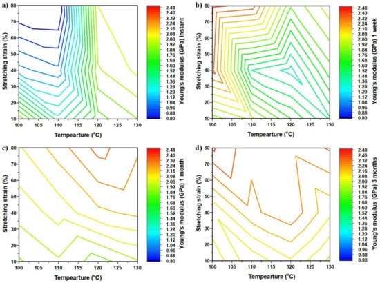 The Young’s modulus, ultimate stress (the maximum engineering stress in cyclic stretching to fracture) and toughness of the tested samples are listed in Table S1 in Supplementary Materials. For easier visualization, the contours of the Young’s modulus, ultimate stress and toughness as a function of stretching strain and stretching temperature after storage at 40 °C for different times are plotted together in Figure 7, Figure 8 and Figure 9, respectively, using Matlab’s contour function.