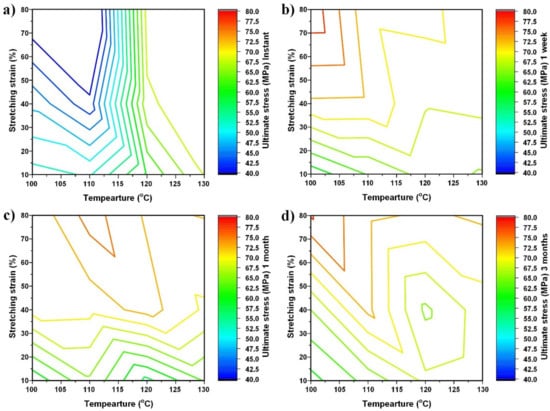 It is worth noting that Figure 8a, which is the ultimate stress of the samples without storage, shares almost the same contour pattern as that of the Young’s modulus in Figure 7a. As defined above, here, the ultimate stress is meant for the maximum engineering stress in cyclic stretching to fracture. According to Figure 4a1,b1,c1, except the sample pre-stretched to 80% strain at 110 °C, in which the stress after reaching the peak of yielding is about constant until fracture, the ultimate stresses of all other samples are their fracture stress (for brittle samples) or their yield stress (for ductile samples). Thus, if the real stress and the real strain are used, the ultimate stress mostly corresponds to the fracture stress, regardless of the fracture mode.