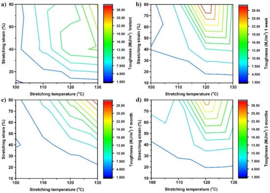 Figure 9 clearly reveals that although pre-stretching does enhance the toughness of the material, the combination of high stretching temperature and high stretching strain is more effective. Refer to Table S1 in Supplementary Materials for the original experimental results. For instantly tested samples as shown in Figure 9a, the toughness of the sample stretched at 100 °C to 10% strain is 1.317 MJ/m3, while that of the sample stretched at 130 °C to 80% is 23.281 MJ/m3, increased over 16 times. After aging for three months, the contour pattern of toughness (Figure 9d) is slightly different. The maximum toughness is found in the sample pre-stretched at 120 °C to 80% strain, and the variation of toughness ranges from 1.476 MJ/m3 to 27.532 MJ/m3. It appears to be feasible to significantly tailor the toughness of this PMMA via high-temperature programming.