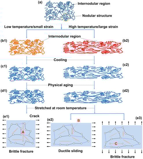 - If the temperature is high (Figure 10b2, the polymer is much softer) and the strain is large, both the nodular structures and internodular regions deform remarkably to match the high strain requirement. During stretching, the molecular chains re-align and the cracks reshape (rotation, elongation in the stretching direction and shrinkage in the transverse direction of stretching) (similar to Figure 10e2,e3). Sliding is in favor to enable large stretching at high temperatures, and the polymer turns to be more packed. Given a polymer, there is always a stretching limit. Overstretching not only weakens the polymer network, but also limits the capability of the pre-stretched polymer to stretch further.