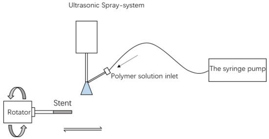 The ultrasonic spray-coating method of Sono-tek Corporation was used to prepare the polymer coatings on stents as in Figure 1. Before being sprayed, the P34HB solutions containing RAPA were prepared (18 mg/mL of P34HB solutions and 1/10 of drug/polymer ratio) and injected into the syringe pump. The spraying parameters were as follows: 0.08 mL/min of solution flow rate, 0.6 w of nozzle power, 0.5 mL/min of focusing pressure, 15 cycles of mandrel moving times and 0.8 cm/s of mandrel moving speed. After the ultrasonic spray coating procedure, the coated stents were taken out and dried at room temperature.